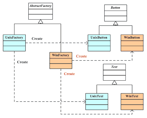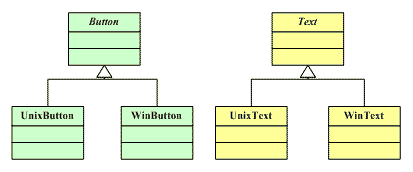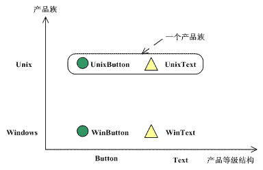 可以发现上面产品类图有两个产品等级结构,分别是Button与Text;同时有两个产品族:Unix产品族与Windows产品族。