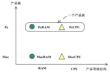 图中一共有四个产品族,分布于三个不同的产品等级结构中。只要指明一个产品所处的产品族以及它所属的等级结构,就可以唯一的确定这个产品。
