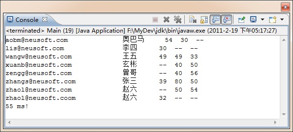 File file = new File(basePath);if (!file.isDirectory()) {logger.info(file.getAbsolutePath() + " is not a directory");} else {try {String[] files = file.list();for (int i = 0; i < files.length; i++) {File targetFile = new File(basePath + "\" + files[i]);BufferedReader br = new BufferedReader(new InputStreamReader(new FileInputStream(targetFile), "GBK"));String s = null;int line = 0;int num = 0;while ((s = br.readLine()) != null) {if (line == 0) {} else {String[] infos = s.split("\t");if (infos.length != 3) {logger.info("错误数据 " + files[i] + " 第"+ (line + 1) + "行");} else {flagSet.add(infos[0] + "\t" + infos[1]);infoList.add(new ExamRecord(infos[0], infos[1],infos[2]));num++;}}line++;}recordsPerFile.add(num);br.close();}} catch (Exception e) {e.printStackTrace();}Iterator<String> it = flagSet.iterator();String str = null;while (it.hasNext()) {str = it.next();String[] infos = str.split("\t");ExamRecord er = new ExamRecord();er.setEmail(infos[0]);er.setName(infos[1]);String[] arrays = new String[recordsPerFile.size()];er.setRecords(arrays);recordList.add(er);}// 开始处理成绩for (int i = 0; i < recordsPerFile.size(); i++) {int num = recordsPerFile.get(i);int count = 0;while (count < recordList.size()) {ExamRecord tmpER = recordList.get(count);tmpER.getRecords()[i] = "--";for (int j = 0; j < num; j++) {ExamRecord er = infoList.get(j);if (tmpER.getEmail().equals(er.getEmail())) {tmpER.getRecords()[i] = er.getRecord();}}count++;}for (int k = 0; k < num; k++) {infoList.remove(0);}}private static void writeResultToFile(String fileName,List<ExamRecord> recordList) {BufferedOutputStream output = null;try {output = new BufferedOutputStream(new FileOutputStream(fileName));for (int i = 0; i < recordList.size(); i++) {ExamRecord examRecord = recordList.get(i);output.write(String.format("%-30s", examRecord.getEmail()).getBytes());output.write(String.format("%-15s", examRecord.getName()).getBytes());for (int j = 0; j < examRecord.getRecords().length; j++) {output.write(String.format("%4s",examRecord.getRecords()[j]).getBytes());}output.write("\r\n".getBytes());}output.flush();} catch (Exception e) {e.printStackTrace();} finally {try {if (output != null) {output.close();}} catch (IOException e) {e.printStackTrace();}}}public static void main(String[] args) throws Exception {long start = System.currentTimeMillis();// 设置LogsetLoggerSettings();// 读取文件到对象中List<ExamRecord> recordList = readFromFile("c:\\test\\src");// 将结果写入文件writeResultToFile("c:\\test\\result.txt", recordList);long end = System.currentTimeMillis();System.out.println(end - start + " ms!");}
