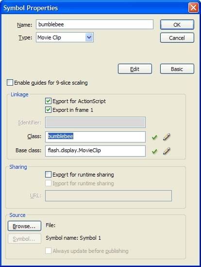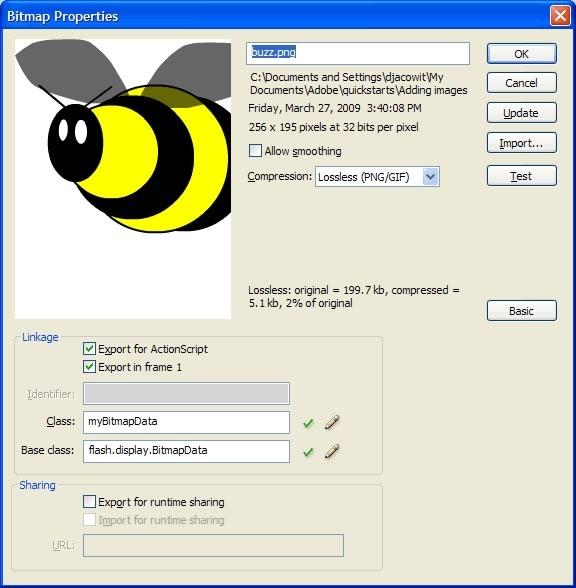 3.使用类名myBitmapData代替Class(类)文本框中的内容,而不是buzz.png。(保留默认的基类名称,它已经被正确地预先填写为flash.display.BitmapData。)