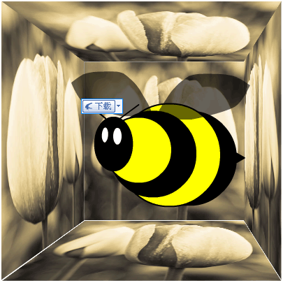 Flash Player播放SWF文件。 五个独立的Bitmap对象实例显示了来自于外部的flowers.jpg文件的数据,以形成立方体的各个面(除了前面)。 然后来源于资源库的bumblebee影片剪辑被加载,并且被显示在盒子的中间位置。