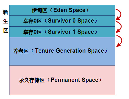 养老区用于保存从新生区筛选出来的JAVA对象,一般池对象都在这个区域活跃。 三个区的示意图如下: