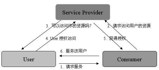 如图 所示 OAuth 解决方案中用户、消费方及其服务提供方之间的三角关系:当用户需要 Consumer 为其提供某种服务时,该服务涉及到需要从服务提供方那里获取该用户的保护资源。OAuth 保证:只有在用户显式授权的情况下(步骤 4),消费方才可以获取该用户的资源,并用来服务于该用户。