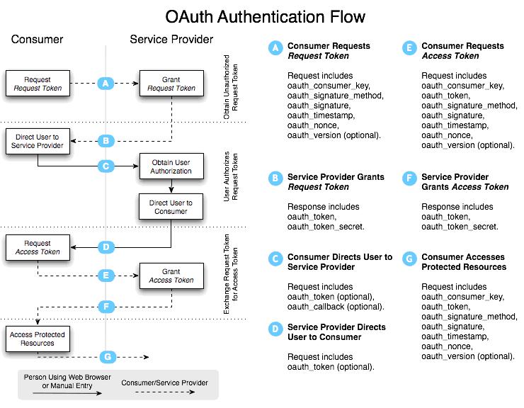 用户好理解,不必多言,消费方和服务提供者则需要解释一下,举例来说:假设我们做了一个SNS,它有一个功能,可以让会员把他们在Google上的联系人导入到SNS上,那么此时的消费方就是SNS,而服务提供者则是Google。