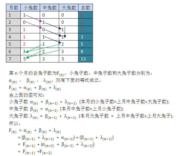 第一个月初有一对刚诞生的兔子 第二个月之后(第三个月初)它们可以生育 每月每对可生育的兔子会诞生下一对新兔子兔子永不死去2.3 兔子问题的分析: