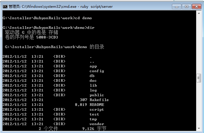 目录之下。因此,我们在这个目录中用rails命令创建一个名为 demo 的应用程序。在这里要加些小心: