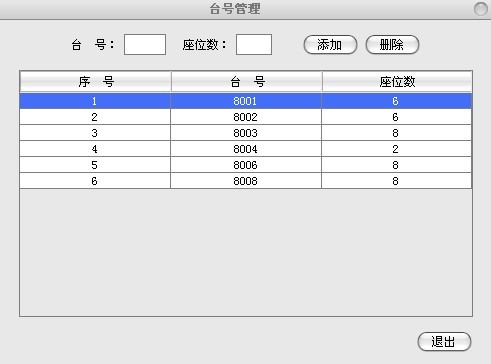 package com.mwq.frame.manage;import java.awt.BorderLayout;import java.awt.Dimension;import java.awt.FlowLayout;import java.awt.event.ActionEvent;import java.awt.event.ActionListener;import java.awt.event.WindowAdapter;import java.awt.event.WindowEvent;import java.util.Vector;import javax.swing.JButton;import javax.swing.JDialog;import javax.swing.JLabel;import javax.swing.JOptionPane;import javax.swing.JPanel;import javax.swing.JScrollPane;import javax.swing.JTable;import javax.swing.JTextField;import javax.swing.table.DefaultTableModel;import com.mwq.dao.Dao;import com.mwq.dao.JDBC;import com.mwq.mwing.MTable;import com.mwq.tool.Validate;public class DeskNumDialog extends JDialog {private JTable table;private JTextField seatingTextField;private JTextField numTextField;private final Vector columnNameV = new Vector();private final DefaultTableModel tableModel = new DefaultTableModel();private final Dao dao = Dao.getInstance();private JTable openedDeskTable;/** * Launch the application * * @param args */public static void main(String args[]) {try {DeskNumDialog dialog = new DeskNumDialog(null);dialog.addWindowListener(new WindowAdapter() {public void windowClosing(WindowEvent e) {System.exit(0);}});dialog.setVisible(true);} catch (Exception e) {e.printStackTrace();}}/** * Create the dialog */public DeskNumDialog(JTable rightTable) {super();setModal(true);getContentPane().setLayout(new BorderLayout());setResizable(false);setTitle("台号管理");setBounds(100, 100, 500, 375);this.openedDeskTable = rightTable;final JPanel operatePanel = new JPanel();getContentPane().add(operatePanel, BorderLayout.NORTH);final JLabel numLabel = new JLabel();operatePanel.add(numLabel);numLabel.setText("台 号:");numTextField = new JTextField();numTextField.setColumns(6);operatePanel.add(numTextField);final JLabel seatingLabel = new JLabel();operatePanel.add(seatingLabel);seatingLabel.setText(" 座位数:");seatingTextField = new JTextField();seatingTextField.setColumns(5);operatePanel.add(seatingTextField);final JLabel topPlaceholderLabel = new JLabel();topPlaceholderLabel.setPreferredSize(new Dimension(20, 40));operatePanel.add(topPlaceholderLabel);final JButton addButton = new JButton();//创建添加台号按钮对象addButton.addActionListener(new ActionListener() {public void actionPerformed(ActionEvent e) {String num = numTextField.getText().trim();// 获取台号,并去掉首尾空格String seating = seatingTextField.getText().trim();// 获取座位数,并去掉首尾空格if (num.equals("") || seating.equals("")) {// 查看用户是否输入了台号和座位数JOptionPane.showMessageDialog(null, "请输入台号和座位数!", "友情提示",JOptionPane.INFORMATION_MESSAGE);return;}if (num.length() > 5) {// 查看台号的长度是否超过了5位JOptionPane.showMessageDialog(null, "台号最多只能为5个字符!", "友情提示",JOptionPane.INFORMATION_MESSAGE);numTextField.requestFocus();// 为台号文本框请求获得焦点return;}if (!Validate.execute("[1-9]{1}([0-9]{0,1})", seating)) {// 验证座位数是否在1——19之间String[] infos = { "座位数输入错误!", "座位数必须在 1——99 之间!" };JOptionPane.showMessageDialog(null, infos, "友情提示",JOptionPane.INFORMATION_MESSAGE);seatingTextField.requestFocus();// 为座位数文本框请求获得焦点return;}if (dao.sDeskByNum(num) != null) {// 查看该台号是否已经存在JOptionPane.showMessageDialog(null, "该台号已经存在!", "友情提示",JOptionPane.INFORMATION_MESSAGE);numTextField.requestFocus();// 为台号文本框请求获得焦点return;}int row = table.getRowCount();// 获得当前拥有台号的个数Vector newDeskNumV = new Vector();// 创建一个代表新台号的向量newDeskNumV.add(new Integer(row + 1));// 添加添加序号newDeskNumV.add(num);// 添加台号newDeskNumV.add(seating);// 添加座位数tableModel.addRow(newDeskNumV);// 将新台号信息添加到表格中table.setRowSelectionInterval(row, row);// 设置新添加的台号为选中的numTextField.setText(null);// 将台号文本框设置为空seatingTextField.setText(null);// 将座位数文本框设置为空//dao.iDesk(num, seating);// 将新添加的台号信息保存到数据库中JDBC.closeConnection();// 关闭数据库连接}});addButton.setText("添加");operatePanel.add(addButton);final JButton delButton = new JButton();//创建删除台号按钮对象delButton.addActionListener(new ActionListener() {public void actionPerformed(ActionEvent e) {int selectedRow = table.getSelectedRow();// 获得选中的餐台if (selectedRow == -1) {// 未选中任何餐台JOptionPane.showMessageDialog(null, "请选择要删除的餐台!", "友情提示",JOptionPane.INFORMATION_MESSAGE);} else {String deskNum = table.getValueAt(selectedRow, 1).toString();// 获得选中餐台的编号for (int row = 0; row < openedDeskTable.getRowCount(); row++) {// 查看该餐台是否正在被使用if (deskNum.equals(openedDeskTable.getValueAt(row, 1))) {JOptionPane.showMessageDialog(null,"该餐台正在使用,不能删除!", "友情提示",JOptionPane.INFORMATION_MESSAGE);return;// 该餐台正在被使用,不能删除,返回}}String infos[] = new String[] {// 组织确认信息"确定要删除餐台:"," 台 号:" + deskNum," 座位数:"+ table.getValueAt(selectedRow, 2).toString() };int i = JOptionPane.showConfirmDialog(null, infos, "友情提示",JOptionPane.YES_NO_OPTION);// 弹出确认提示if (i == 0) {// 确认删除dao.dDeskByNum(deskNum);// 从数据库中删除tableModel.setDataVector(dao.sDesk(), columnNameV);// 刷新表格int rowCount = table.getRowCount();// 获得删除后拥有的餐台数if (rowCount > 0) {// 还拥有餐台if (selectedRow == rowCount)// 删除的为最后一个餐台selectedRow -= 1;// 将选中的餐台前移一行table.setRowSelectionInterval(selectedRow,selectedRow);// 设置当前选中的餐台}JDBC.closeConnection();// 关闭数据库连接}}}});delButton.setText("删除");operatePanel.add(delButton);final JScr