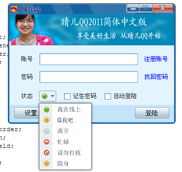 寝室同学开了家餐厅,所以最近一段时间一直没怎么上Javaeye写博客,课余时间几乎都在他们那帮忙,利用晚上回寝室休息的时间再对原来界面进行了些改进,添加了登录状态选择组件,希望能彻底达到“终极”山寨的效果,效果截图如下: