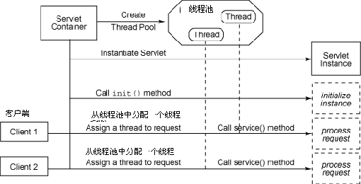 容器收到一个Servlet请求,调度线程从线程池中选出一个工作者线程,将请求传递给该工作者线程,然后由该线程来执行Servlet的 service方法。当这个线程正在执行的时候,容器收到另外一个请求,调度线程同样从线程池中选出另一个工作者线程来服务新的请求,容器并不关心这个请求是否访问的是同一个Servlet.当容器同时收到对同一个Servlet的多个请求的时候,那么这个Servlet的service()方法将在多线程中并发执行。