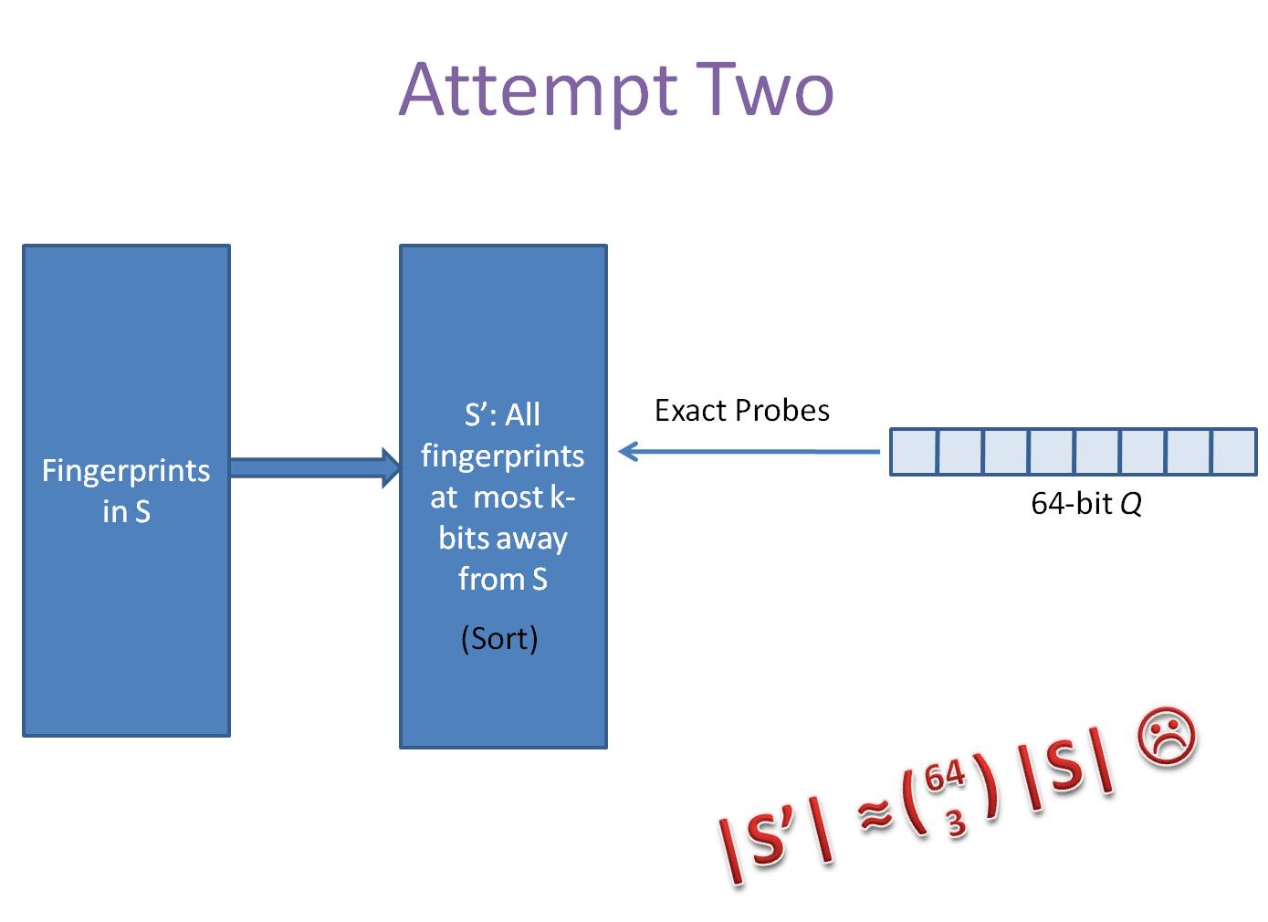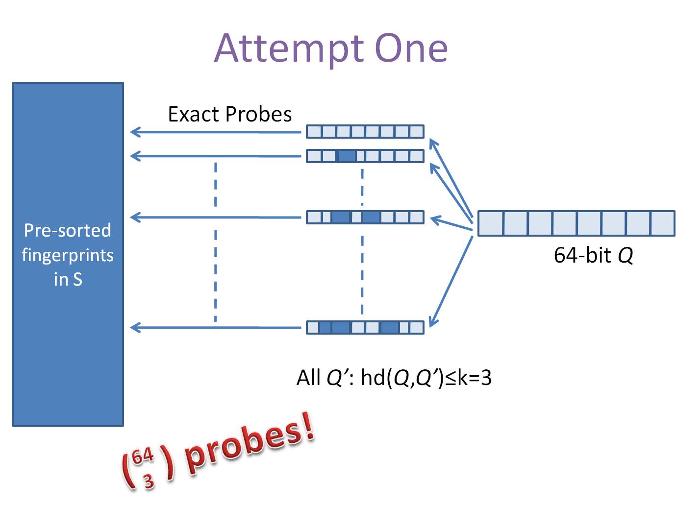 使用上述方法产生的simhash可以用来比较两个文本之间的相似度。问题是,如何将其扩展到海量数据的近重复检测中去呢?譬如说对于64位的待查询文本的simhash code来说,如何在海量的样本库(>1M)中查询与其海明距离在3以内的记录呢?下面在引入simhash的索引结构之前,先提供两种常规的思路。第一种是方案是查找待查询文本的64位simhash code的所有3位以内变化的组合,大约需要四万多次的查询,参考下图:
