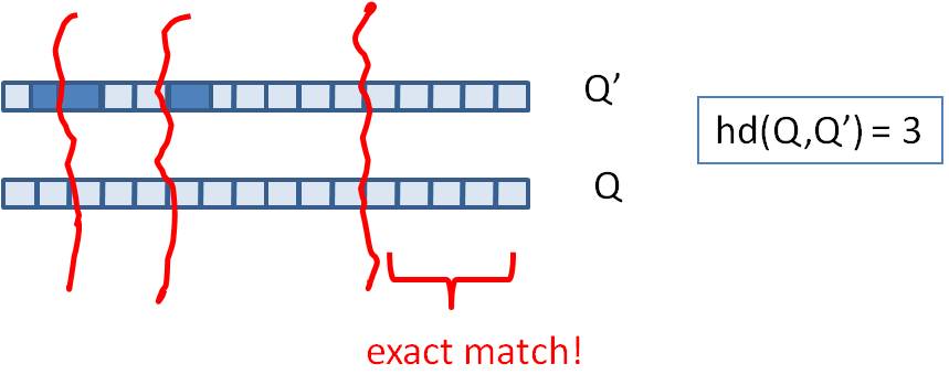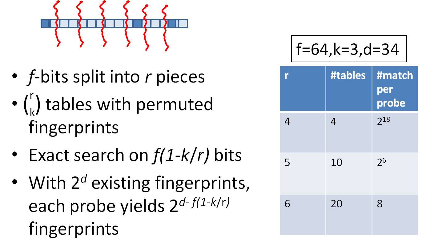 另一种方案是预生成库中所有样本simhash code的3位变化以内的组合,大约需要占据4万多倍的原始空间,参考下图: