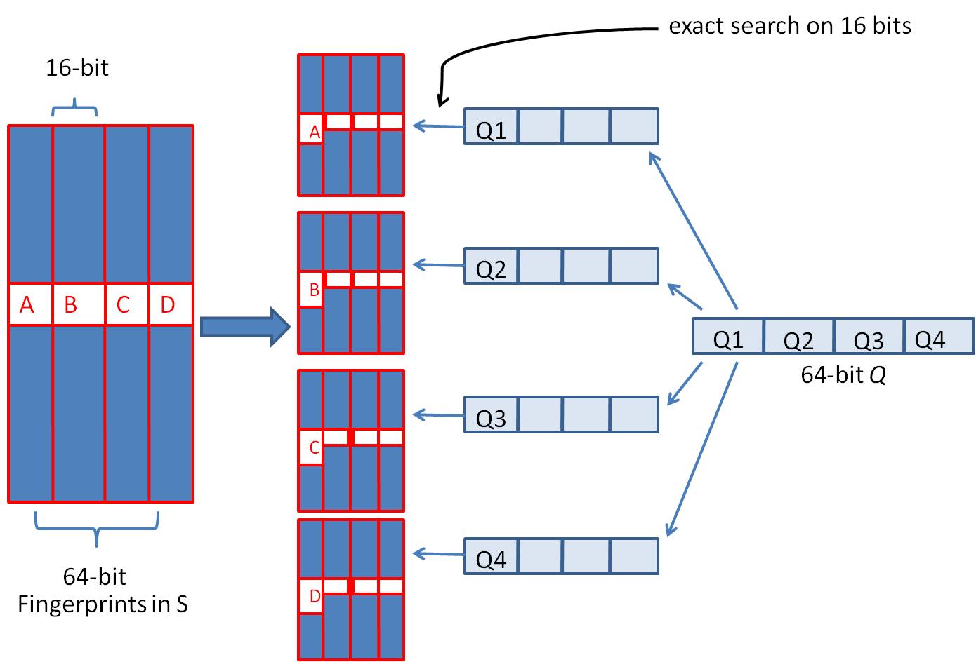 由于我们无法事先得知完全相同的是哪一块区域,因此我们必须采用存储多份table的方式。在本例的情况下,我们需要存储4份table,并将64位的simhash code等分成4份;对于每一个输入的code,我们通过精确匹配的方式,查找前16位相同的记录作为候选记录,如下图所示:
