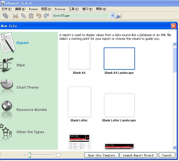 可以选择一个ireport提供的template,有带图片效果样式的和空的,这里选择Blank A4 Lanscape。然后“open this template”