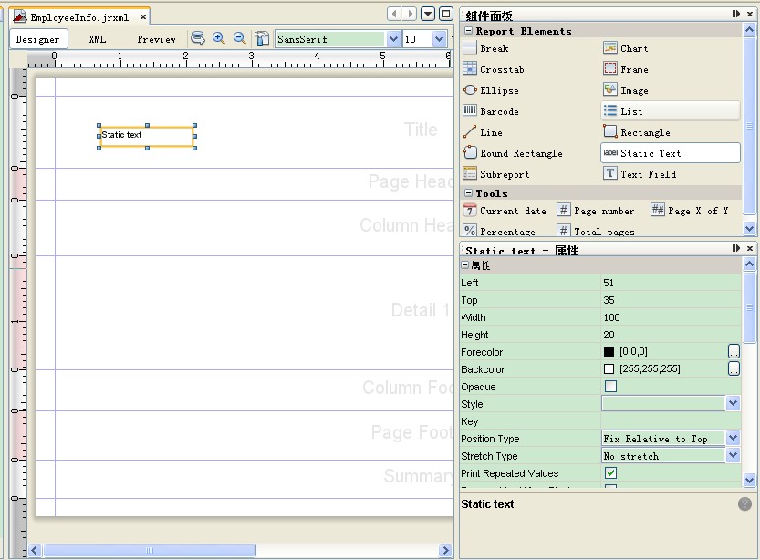 2.左边报表编辑面板,右上组件面板,右下属性面板;可直接拖拽一个组件至报表上,选中组件在属性面板就可以编辑此组件的属性。