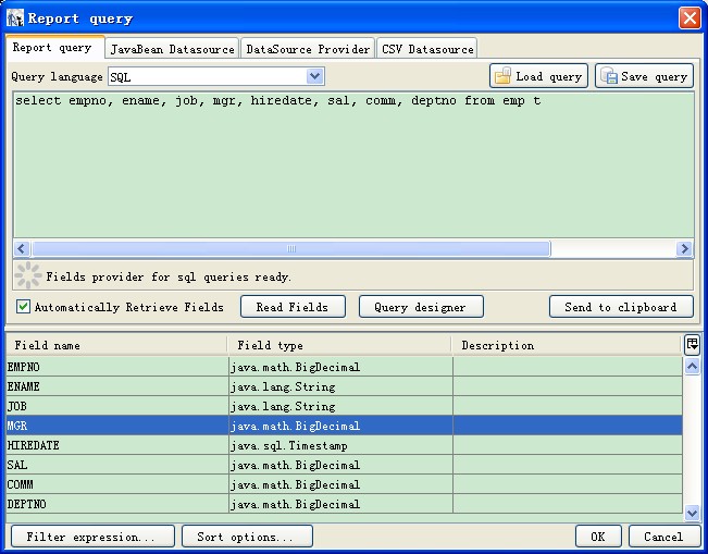 2.将sql语句放置到里面,“read fields”,sql语句即为从数据源取数据至报表的sql,点击“ok”