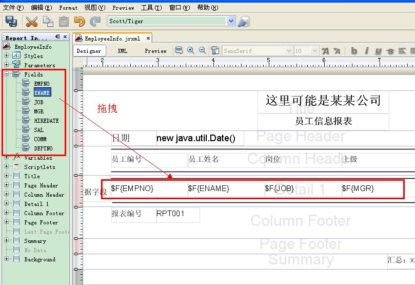 4.从Fields的子节点拖拽我们填好的sql查询出字段值报表的Detail区