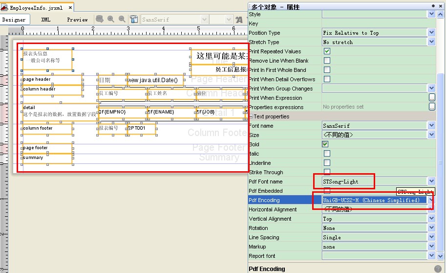 2.在报表编辑版面选中所有文本框,在属性面板设置: