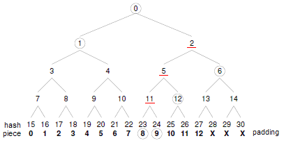 当client从某一peer下载一个数据块时,它将事先向peer发出相应的校验查询请求,要求对方提供校验当前下载块所需的路径哈希值,这一过程可以很方便地通过扩展标准的Peer Wire Protocol实现。以上图为例,当client下载的是数据块8时,在下载开始之前,它将要求peer提供校验块8所需的全部路径哈希值:H24、H12、H6和H1;