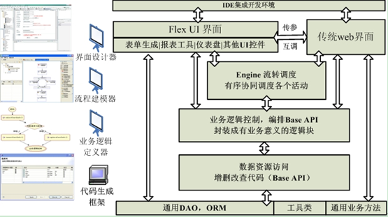 开发方法论和联创的大体类似,并借鉴了动量的Web界面快速生成的思想以及管理模块的概念,提出了我们特有的方法论。开发团队分为前后端,前端web开发人员调用后端服务设计人员编写的开放业务编程接口(OBPI);在需要多台后台逻辑服务器的情况下,采取通用远程调用接口(URCI)的方式部署。前端界面采取FlexUI快速设计界面;后端逻辑采取表驱动方式设计,并依托工具生成基本的增删改查代码,前端展现和后台通过接口(OBPI)的方式进行绑定,这种方式即有利于行业软件的自身积累,也能在互联网应用中快速开发。该部分内容在《xx业务基础平台可行性研究报告》中有详细说明,这里不详细阐述。