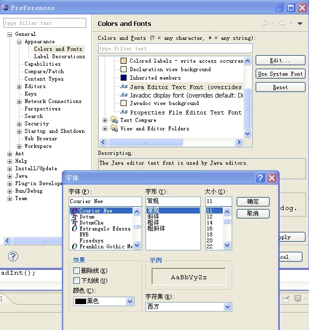 eclipse中的几个常用设置1.改变字体首先打开eclipse,按下面的方法即可修改字体。菜单项:window -preferenc