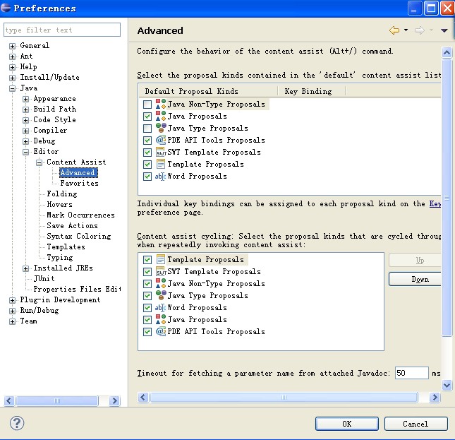 Window->Preferences->Java->Editor->Content Assist->Advanced选项