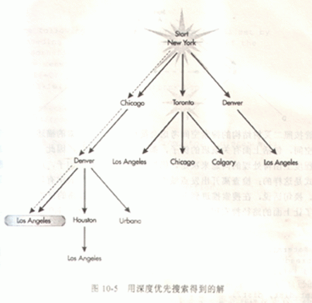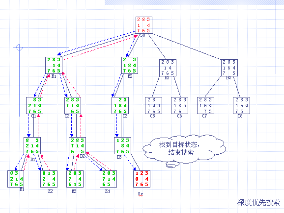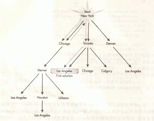 深度优先搜索能够找到一个解,同时,对于上面这个特定问题,深度优先搜索没有经过回退,一次就找到了一个解;但如果数据的组织方式不同,寻找解时就有可能进行多次回退。因此这个例子的输出并不具有普遍性。而且,在搜索一个很长,但是其中并没有解的分支的时候,深度优先搜索的性能将会很差,在这种情况下,深度优先搜索不仅在搜索这条路径时浪费时间,而且还在向目标的回退中浪费时间。