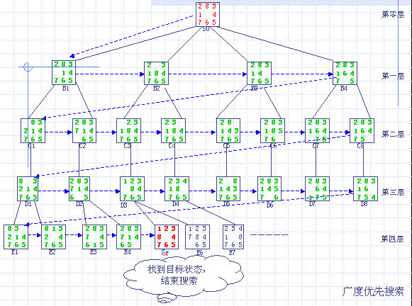 在深度优先搜索算法中,是深度越大的结点越先得到扩展。如果在搜索中把算法改为按结点的层次进行搜索, 本层的结点没有搜索处理完时,不能对下层结点进行处理,即深度越小的结点越先得到扩展,也就是说先产生 的结点先得以扩展处理,这种搜索算法称为广度优先搜索法。