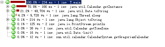 从这个数据,可以找到各个方法调用次数和消耗的时间,很显然这个例子的Calendar.getInstance消耗了 70.9%的时间。我们的j2ee应用也可以使用这样的工具去找出这些效率点。