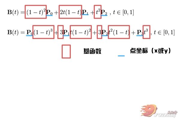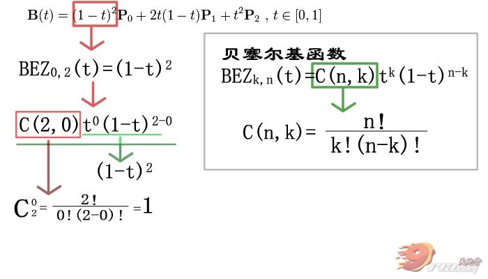 其公式主要成分为基函数(贝塞尔曲线计算耗时的原因),基函数推导过程(以二次为例):