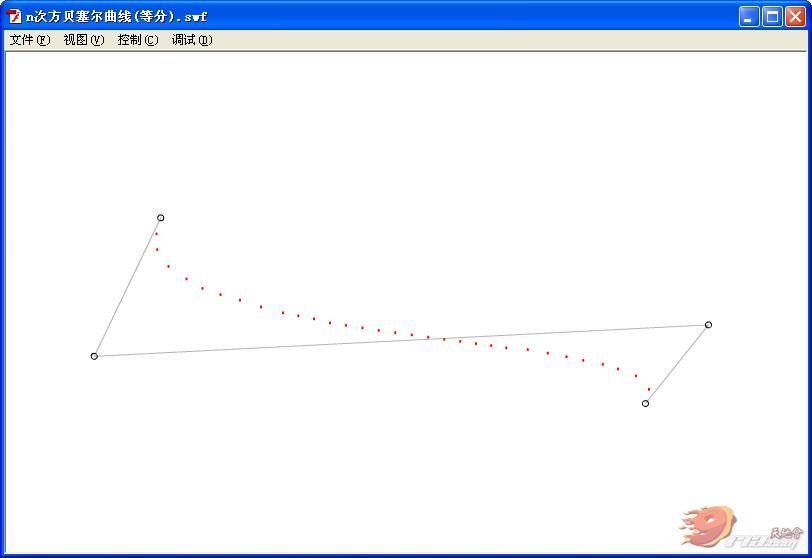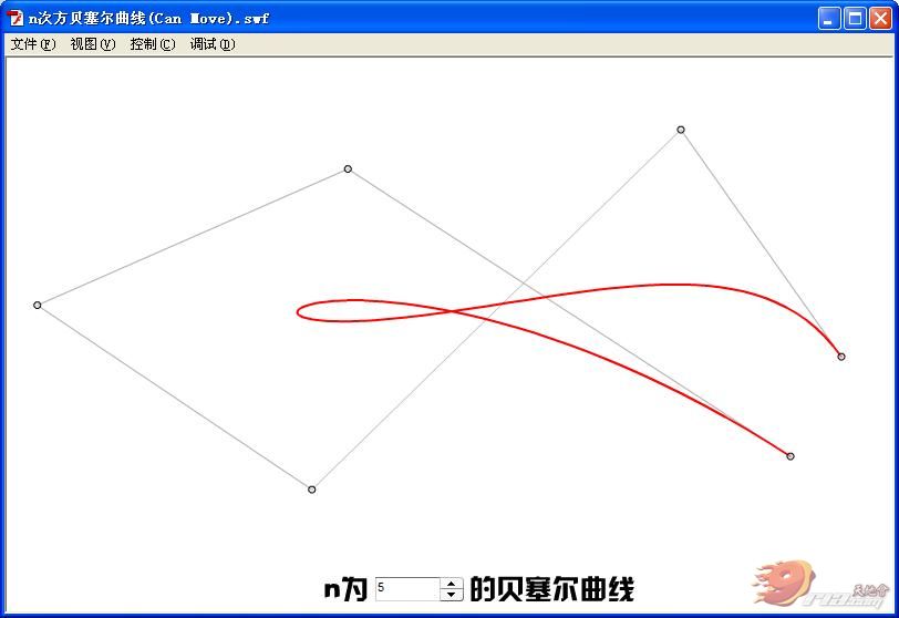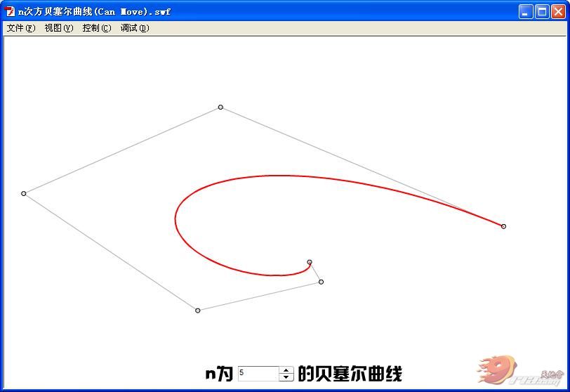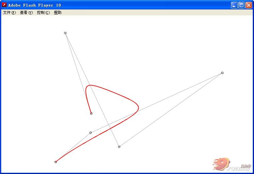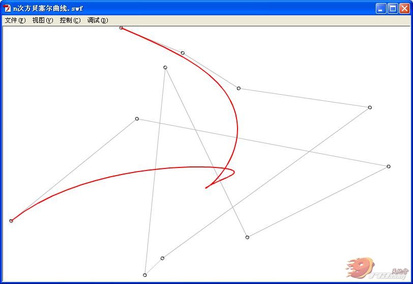 function BEZ(n:int,k:int,t:Number):Number {//基函数 return C(n,k)*Math.pow(t,k)*Math.pow(1-t,n-k);}function C(n:int,k:int):Number {//组合排序 var son:int=jie_cheng(n); var mother:int=jie_cheng(k)*jie_cheng(n-k); return son/mother;}function jie_cheng(i:int):int {//阶乘 var n:int=1; for (var j:int=1; j<=i; j++) { n*=j; } return n;}var points:Array = [];var sp:Sprite=new Sprite();var n:int = 5;addChild(sp);draw_points(points,n);function P_BEZ(t:Number,sz:Array):Point {//n次 var x_p:Number = 0; var y_p:Number = 0; var n:int = sz.length; for (var i:int=0; i<sz.length; i++) { var b:Number = BEZ(n - 1,i,t); x_p += sz[i].x * b; y_p+=sz[i].y*b; } return (new Point(x_p,y_p));}function BEZ(n:int,k:int,t:Number):Number {//基函数 return C(n,k)*Math.pow(t,k)*Math.pow(1-t,n-k);}function C(n:int,k:int):Number {//组合排序 var son:int=jie_cheng(n); var mother:int=jie_cheng(k)*jie_cheng(n-k); return son/mother;}function jie_cheng(i:int):int {//阶乘 var n:int=1; for (var j:int=1; j<=i; j++) { n*=j; } return n;}function draw_points(sz:Array,n:int):void { sz.length=0; for (var i:int=0; i<=n; i++) { sz[i]=new Point(800*Math.random(),500*Math.random()); draw_point(sz[i]); } draw_lines(sz); sp.graphics.lineStyle(2,0xff0000); var p:Point=P_BEZ(0,sz); sp.graphics.moveTo(p.x,p.y); for (var j:Number=0; j<1; j+=0.01) { p=P_BEZ(j,sz); sp.graphics.lineTo(p.x,p.y); } p=P_BEZ(1,sz); sp.graphics.lineTo(p.x,p.y);}function draw_point(p:Point):void {//画点 sp.graphics.lineStyle(0); sp.graphics.drawCircle(p.x,p.y,3);}function draw_lines(sz:Array):void {//画边 sp.graphics.lineStyle(0,0,0.3); sp.graphics.moveTo(sz[0].x,sz[0].y); for (var i:int=0; i<sz.length; i++) { var p:Point=sz[i]; sp.graphics.lineTo(p.x,p.y); }}