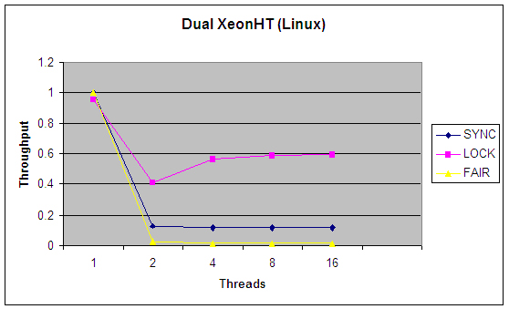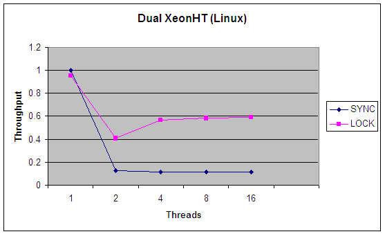 在这个基准程序中,有一个 PseudoRandom 的接口,它只有一个方法 nextRandom(int bound) 。该接口与 java.util.Random 类的功能非常类似。因为在生成下一个随机数时,PRNG 用最新生成的数字作为输入,而且把最后生成的数字作为一个实例变量来维护,其重点在于让更新这个状态的代码段不被其他线程抢占,所以我要用某种形式的锁定来确保这一点。( java.util.Random 类也可以做到这点。)我们为 PseudoRandom 构建了两个实现;一个使用 syncronized,另一个使用 java.util.concurrent.ReentrantLock 。驱动程序生成了大量线程,每个线程都疯狂地争夺时间片,然后计算不同版本每秒能执行多少轮。图 1 和 图 2 总结了不同线程数量的结果。这个评测并不完美,而且只在两个系统上运行了(一个是双 Xeon 运行超线程 Linux,另一个是单处理器 Windows 系统),但是,应当足以表现 synchronized 与 ReentrantLock 相比所具有的伸缩性优势了。