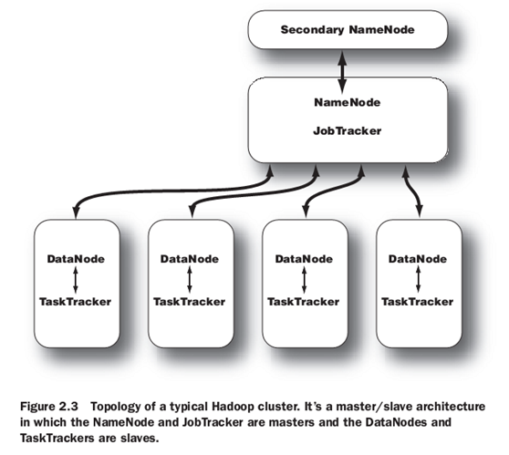 Hadoop的进程、结点对应图 摘自 Hadoop In Action1.NameNode和JobTracker可以分拆到两台机上2.DataNode和TaskTracker有对应的关系,在每台机器上要成对出现3.NameNode和JobTracker都是单点