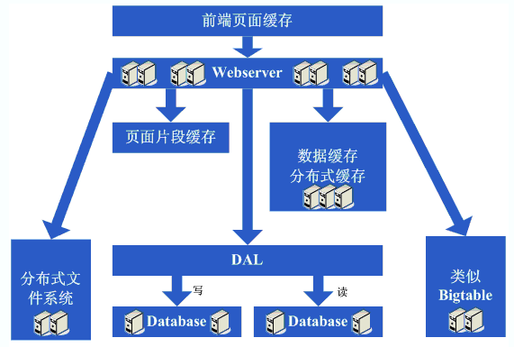网站架构的演变过程 这里总结下网站架构的演变过程:架构演变第一步:物理分离webserver和数据库架构演变第二步:增加页面缓存架构演变第三步:增加页面片段缓存架构演变第四步:数据缓存架构演变第五步:前段增加webserver架构演变第六步:数据库分库架构演变第七步:分表、DAL和分布式缓存架构演变第八步:增加更多的webserver,分布式文件系统架构演变第九步:数据读写分离加廉价存储方案9.png
