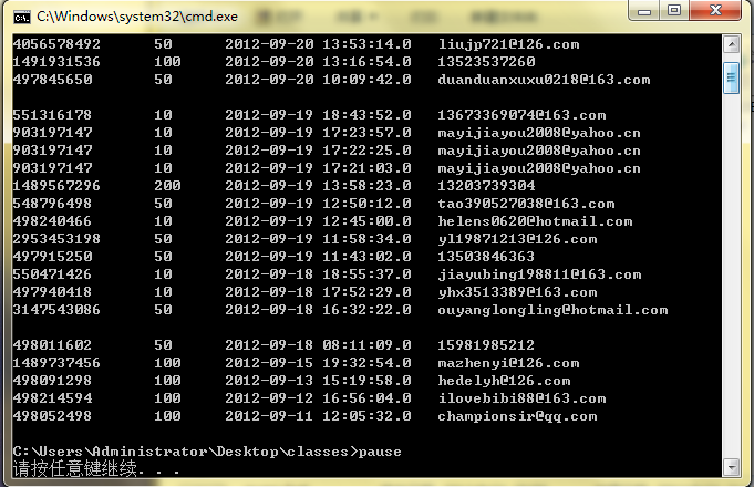 import java.io.FileNotFoundException;import java.sql.Connection;import java.sql.DriverManager;import java.sql.ResultSet;import java.sql.SQLException;import java.sql.Statement;import java.util.Map;import javax.xml.bind.JAXBException;public class QueryBtwRecharge {public void query() throws FileNotFoundException, JAXBException, ClassNotFoundException, SQLException{ConnConfReader connConfReader=new ConnConfReader();Map<String,String> map=connConfReader.getConnConf();String dbDriver=map.get("dbDriver");String url=map.get("url");String user=map.get("user");String password=map.get("password");String sql=map.get("sql");Class.forName(dbDriver);Connection conn=DriverManager.getConnection(url, user, password);Statement stmt=conn.createStatement();ResultSet rs=stmt.executeQuery(sql);while(rs.next()){//System.out.println(rs.getString("cardnum")+"\t"+//rs.getString("total_fee")+"\t"+//rs.getString("createdate")+"\t"+//rs.getString("ip")+"\t"+//rs.getString("buyer_email")+"\t"//);System.out.println(rs.getString(1)+"\t"+rs.getString(2)+"\t"+rs.getString(3)+"\t"+rs.getString(4)+"\t");}if(rs!=null){rs.close();}if(stmt!=null){stmt.close();}if(conn!=null){conn.close();}}}