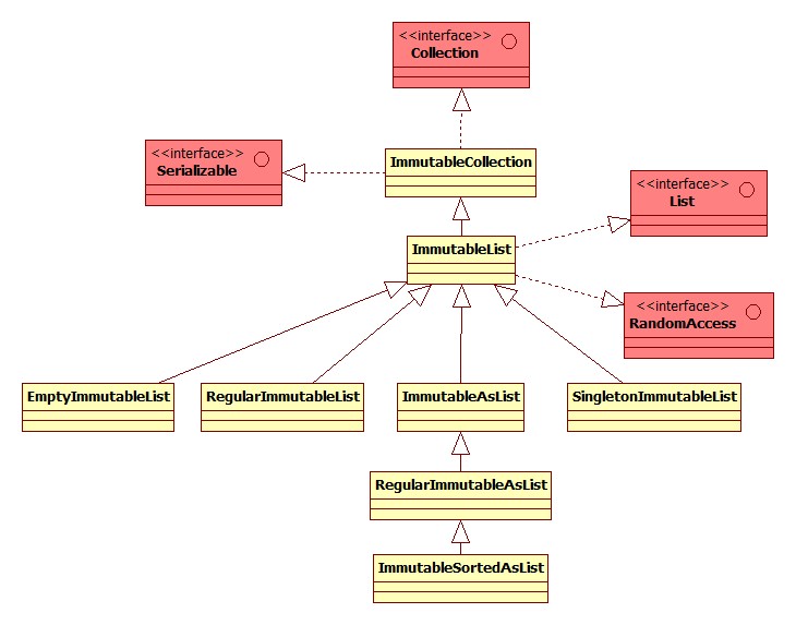 先从List说起,Guava包中只有一种List,即【abstract class】ImmutableList,其有四个实现类:EmptyImmutableList,SingletonImmutableList,RegularImmutableList,【abstract class】ImmutableAsList,如下图(红色背景属于JDK,黄色背景属于Guava。点开大图清晰,弱问,怎么把图100%显示?):