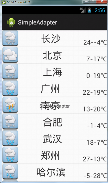 package com.veryedu.simpleadapter;import java.util.ArrayList;import java.util.HashMap;import java.util.List;import java.util.Random;import android.os.Bundle;import android.app.Activity;import android.util.Log;import android.view.Menu;import android.widget.ListView;import android.widget.SimpleAdapter;public class MainActivity extends Activity {/** * @author 梦想家Dream * 利用适配器显示一个图片+两个文本信息到一个ListView上 */@Overrideprotected void onCreate(Bundle savedInstanceState) {super.onCreate(savedInstanceState);setContentView(R.layout.activity_main);String[] citys={"长沙","北京","上海","广州","南京","合肥","武汉","郑州","哈尔滨","长春","沈阳","天津","杭州","福州","南宁","昆明","南昌","石家庄","呼和浩特","乌鲁木齐","西安","西宁","兰州","银川","拉萨","重庆","成都","贵阳","海口","深圳",};ListView list_view=(ListView)this.findViewById(R.id.text_view);List data=new ArrayList();Class cls=R.raw.class;Random r=new Random();try {for (int i = 0; i < citys.length; i++) {String name="a"+r.nextInt(32);HashMap map=new HashMap();map.put("sky", cls.getField(name).getInt(null)); //反射的方式获得图片map.put("city", citys[i]);map.put("temperature", r.nextInt(40)-10+"-"+(r.nextInt(40)-10)+"℃"); //随机生成一个温度(现实中这个是从网络上拿的)data.add(map);}} catch (Exception e) {Log.e("TAG", e.toString());StackTraceElement[] stes=e.getStackTrace();for(int i=0;i<stes.length;i++){Log.e("TAG", stes[i].toString());}}String [] from={"sky","city","temperature"};int [] to={R.id.city_sky_img,R.id.city_name,R.id.city_temperature};SimpleAdapter simpleAdapter=new SimpleAdapter(this, //你懂的,不解释 data, //你要显示的数据源 R.layout.list_view, //显示的目的地的Id from, //数据源map的键(拿值放入到下面的相对应的位置中) to); //数据源中的值的目标位置list_view.setAdapter(simpleAdapter); // 设置适配器(其实就是将适配器中的数据设置到当前ListView中)}@Overridepublic boolean onCreateOptionsMenu(Menu menu) {// Inflate the menu; this adds items to the action bar if it is present.getMenuInflater().inflate(R.menu.activity_main, menu);return true;}}
