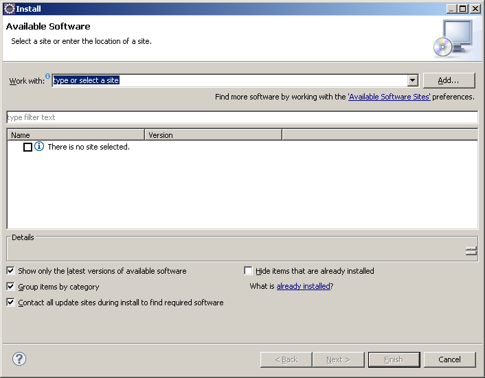 启动eclipse,单击Help菜单,单击Install New Software...“安装新软件...”菜单项,出现如下图所示Install“安装”对话框