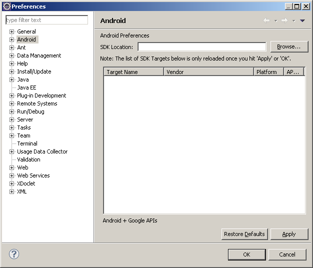 单击Preferences菜单项,将在左侧看到出现Android项,单击Android项可以看到如下图所示Android设置。