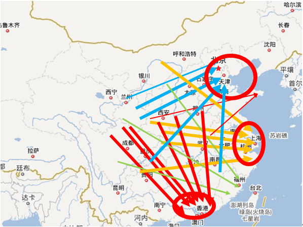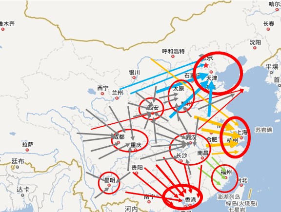 关于春运一票难求问题的一些随想随记[sizesmall][sizex-small](图一)箭头表示:箭头经过地区的大量人到箭