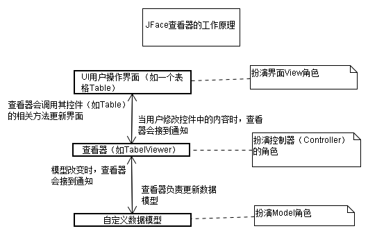 查看器(如TableViewer)将数据模型从复杂的控件(如Table)中抽象出来,本身作为一个控制器来监听模型的变化和控件的变化,并负责传递这些变化。