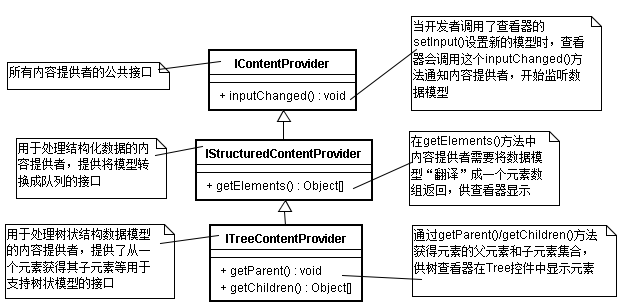 所有的内容提供者都要实现接口IContentProvider,对应到具体的子类查看器,又有针对它们的数据结构的各种接口,如列表查看器和表格查看器要求内容提供者实现