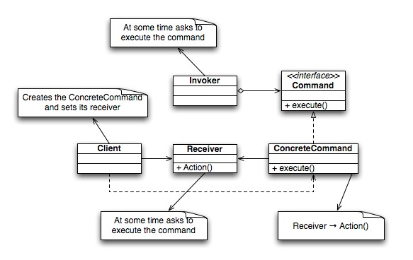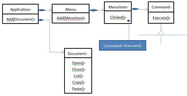 该应用为每一个菜单项配置一个具体的Command子类的实例。当用户选择了一个菜单项时,该MenuItem对象调用它的Command对象的Execute方法,而Execute执行相应的操作。MenuItem对象并不知道他们使用的是Command的哪一个子类。Command子类存放着请求的接受者,而Execute操作将调用该接受者的一个或多个操作。