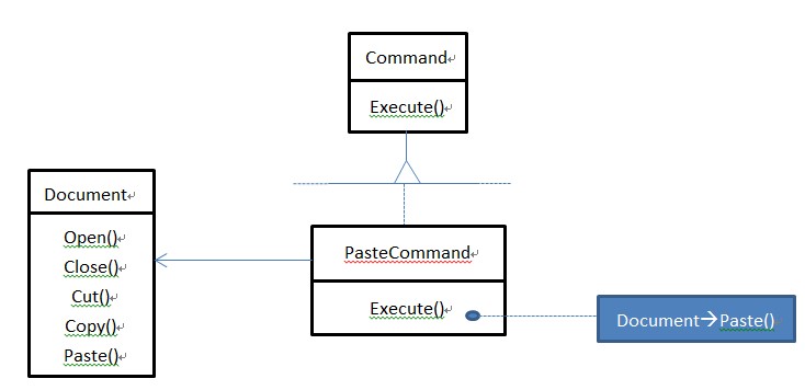 例如,PasteCommand支持从剪贴板向一个文档(Document)粘贴正文。PasteCommand的接受者是一个文档对象,该对象是实例化时提供的。Execute操作将调用该Document的Paste操作。