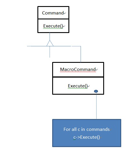 有时一个MenuItem需要执行一系列命令。例如,使一个页面按正常大小居中的MenuItem可由一个CenterDocumentCommand对象和一个NormalSizeCommand对象构建。因为这种需将多条命令串联起来的情况很常见,我们定义一个MacroCommand类来让一个MenuItem自行任意数目的命令。MacroCommand是一个具体的Command子类,它接受一个命令序列。MacroCommand没有明确的接受者,而序列中的命令各自定义其接受者。