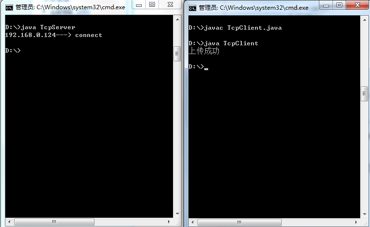 import java.net.*;import java.io.*;public class TcpClient {public static void main(String[] args)throws Exception {Socket s = new Socket("192.168.0.124",10005);BufferedReader bufr = new BufferedReader(new FileReader("client.txt"));//BufferedWriter buOut = new BufferedWriter(new OutputStreamWriter(s.getOutputStream()));PrintWriter out = new PrintWriter(s.getOutputStream(),true);String line = null;while((line=bufr.readLine())!=null){//这里我刚开始的时候写的是out.write(line),出现问题:server.txt里面//没有东西,是空的。必须要在后面加上“\r\n”和flush刷新。//out.write(line+"\r\n");//out.flush();out.println(line);} //关闭客户端的输出流,相当于给流中加入一个结束标记-1。s.shutdownOutput();BufferedReader bufIn = new BufferedReader(new InputStreamReader(s.getInputStream()));String str = bufIn.readLine();System.out.println(str);bufr.close();s.close();}}import java.net.*;import java.io.*;class TcpServer {public static void main(String[] args)throws Exception {ServerSocket ss = new ServerSocket(10005);Socket s = ss.accept();String ip = s.getInetAddress().getHostAddress();System.out.println(ip+"---> connect");BufferedReader bufin = new BufferedReader(new InputStreamReader(s.getInputStream()));PrintWriter out = new PrintWriter(new FileWriter("server.txt"),true);String line = null;while((line=bufin.readLine())!=null){out.println(line);}PrintWriter pw = new PrintWriter(s.getOutputStream(),true);pw.println("上传成功");out.close();s.close();ss.close();}}