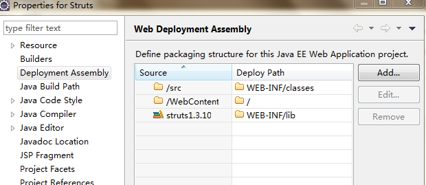 右键点击工程,属性(properties),选择deployment assembly选项,单击add按钮,如下图: