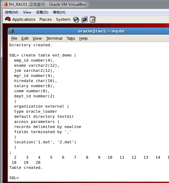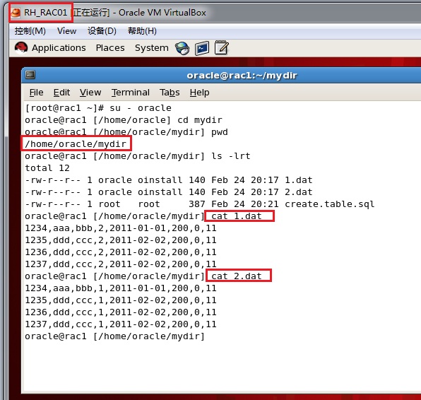 1、在rac1上,建立(将被共享的)目录和相关文件(供外部表载入,1.dat,2.dat)