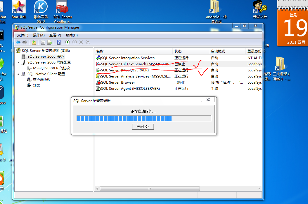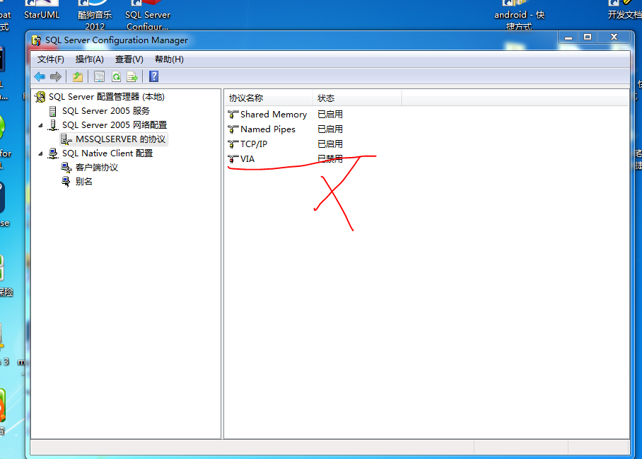 打开 \Microsoft SQL Server 2005\配置工具\目录下的SQL Server Configuration Manager--->网络配置选择mssqlserver协议, 然后右边窗口有个tcp/ip协议,然后启动它,把sqlserver服务停了,然后在启动。问题就解决了!