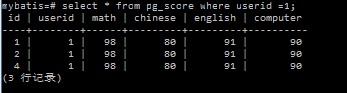 第1个score对象为:id = 1,math = 98,chinese = 80,english = 91,computer = 90, userid = 1,username = yangjianzhou:0,password = password:0,address = password:0第2个score对象为:id = 2,math = 98,chinese = 80,english = 91,computer = 90, userid = 1,username = yangjianzhou:0,password = password:0,address = password:0第3个score对象为:id = 4,math = 98,chinese = 80,english = 91,computer = 90, userid = 1,username = yangjianzhou:0,password = password:0,address = password:0