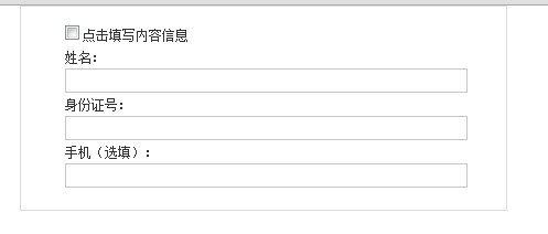 <!DOCTYPE htm><head><meta http-equiv="Content-Type" content="text/html; charset=utf-8" /><meta http-equiv="X-UA-Compatible" content="IE=EmulateIE7" /><script type="text/javascript" src="http://code.jquery.com/jquery-1.9.1.js"></script></head><body><style type="text/css">*{margin:0;margin:0;list-style-type:none;}a,img{border:0;}img{vertical-align:middle;}label{cursor:pointer;}address,caption,cite,code,dfn,em,strong,th,var,optgroup{font-style:normal;font-weight:normal}input,button,textarea,select,optgroup,option{font-family:inherit;font-size:inherit;font-style:inherit;font-weight:inherit}input,button,textarea,select{*font-size:100%}body{font:12px/180% Arial,"宋体";color:#333;}.formbox{width:400px;border:solid 1px #ddd;padding:10px 20px 20px 20px;margin:0 auto;}.findfive{height:20px;overflow:hidden;padding:5px 0 0 20px;}/* findform */#findform{padding:0 0 0 20px;}#findform li .inputext{width:360px;height:20px;line-height:20px;padding:0 0 0 3px;background:url(images/inputbg.png) no-repeat;border:solid 1px #c6c6c6;}#findform li .inputext input{border:none;font-family:Arial;background:none;width:97%;margin:3px 0 0 0;}#findform li .grayinput{background:url(images/inputgraybg.png) no-repeat;}</style><div name="" id="five" /> <label for="five">点击填写内容信息</label></div><ul id="findform" name="" value="" id="" disabled="disabled" /></div></li><li><span name="" value="" id="" disabled="disabled" /></div></li><li><span name="" value="" id="" disabled="disabled" /></div></li></ul></div><!--formbox end--><script type="text/javascript">$(document).ready(function(){//定义一个可以激活所有函数的方法$("#five").click(function(){//定义一个点击事件if($(this).attr("checked")){//如果改变图像的 width 属性 checked 属性设置或返回 checkbox 是否应被选中$("#findform li input").removeAttr("disabled","");//定义一个 从 findform li input 里面删除 disabled $("#findform li .inputext").removeClass("grayinput");//定义 在从 findform li .inputext里面删除掉 grayinput 类}else{//否则$("#findform li input").attr("disabled","disabled");//findform li input 改变图片的 width 属性 disabled$("#findform li .inputext").addClass("grayinput");//在findform li .inputext里面添加一个grayinput类}})});</script></body></html>